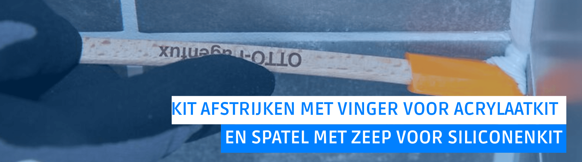 - Huidvorming van kit: Houd rekening met huidvorming! Kit kan bij kamertemperatuur al een huidje krijgen na ongeveer 10 tot 15 minuten. Hierdoor kan het, als je wat minder snel werkt, lastig zijn om een heel kozijn volledig af te kitten en vervolgens in één keer af te werken. Twijfel je? Breng dan eerst een gedeelte aan (bijvoorbeeld de onderzijde en één zijkant) en strijk dit direct af. Zeep dan uiteraard niet de hele voeg in, want dan hecht de nieuw aangebrachte kit niet meer aan de reeds gezette kit. Werk in kleinere secties indien nodig.