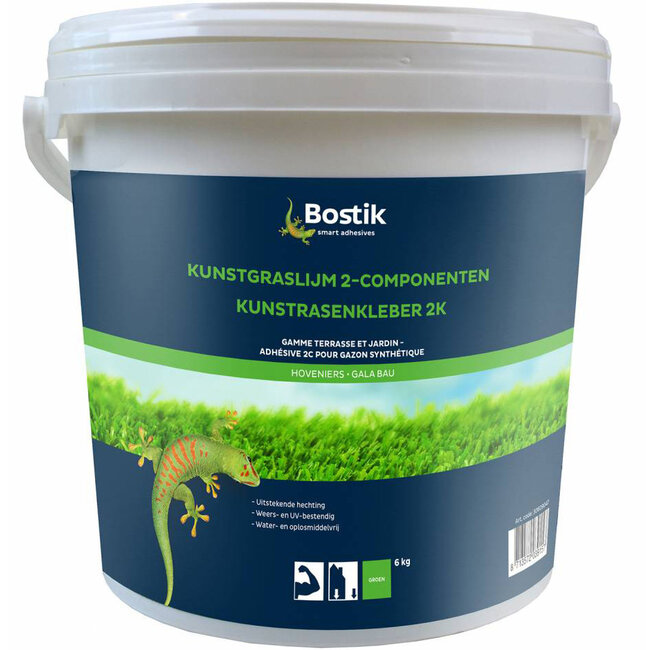 Bostik La colle bi-composante pour gazon artificiel Bostik est une colle polyuréthane bi-composante écologique et de haute qualité, conçue pour le collage intégral du gazon artificiel. Adaptée à la plupart des surfaces, telles que les bandes géotextiles, les chapes en béton et les surfaces métalliques, elle peut être utilisée aussi bien à l'intérieur qu'à l'extérieur. Cette colle bi-composante pour gazon artificiel s'applique sur le ruban adhésif Bostik doté d'une encoche à 4 dents.