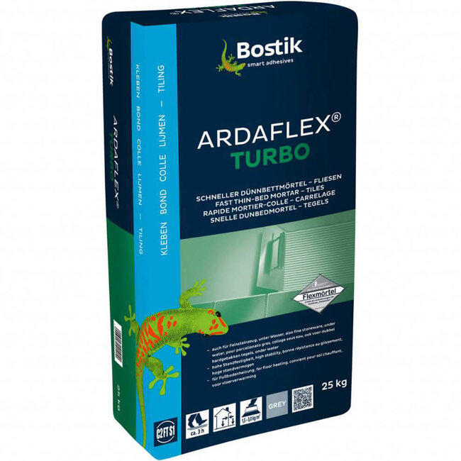 Bostik Ardaflex Turbo colle en poudre est, après ajout d'eau, un mortier-colle facile à utiliser et à prise rapide, contenant un pourcentage élevé d'additifs de résine synthétique améliorant l'adhérence. Le mortier durci est imperméable et résistant au gel. Ardaflex Turbo est conforme aux exigences C2 FT - S1 des normes DIN EN 12004/12002 et aux directives relatives aux mortiers flexibles. Il est également conforme à la norme EC1.
