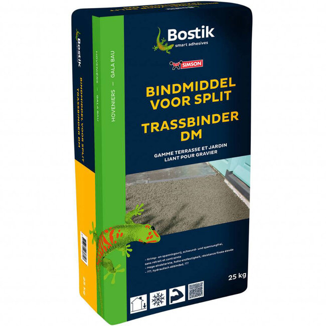 Le liant pour gravillons Bostik est un liant cimentaire enrichi en trass et en plastique, permettant la production d'un mortier de drainage extrêmement stable, mortier de drainage, pour la pose de dalles en béton, clinker, pierre naturelle et céramique, en intérieur comme en extérieur.