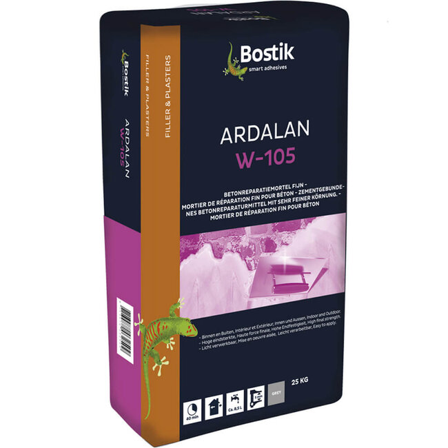 Bostik Ardalan W-105 is na toevoeging van water een hydraulisch uithardende, fijnkorrelig uitvlakmortel voor wanden.
